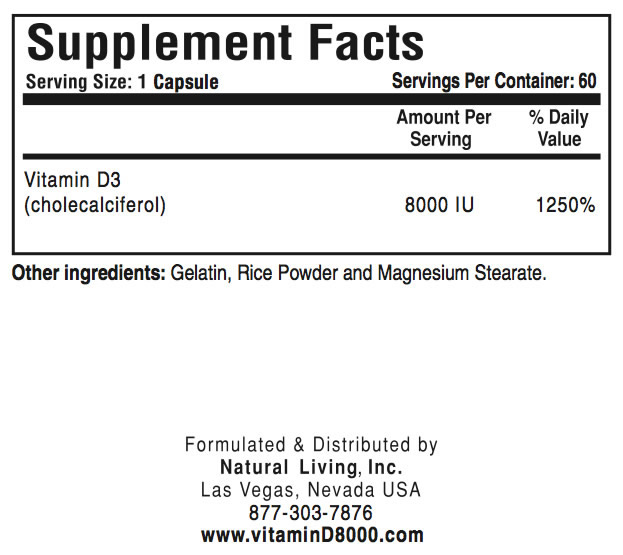 Natural Living High Potency Vitamin D3 8000 Iu 60 Capsules 1 PackNATURAL LIVING PRODUCTS ARE THE BEST...TAKING VITAMIN D3 8000 HAS MADE A DIFFERENCE IN MY LIFE...I ALSO TAKE THE IODINE...NOW MY THYROID NOMAL